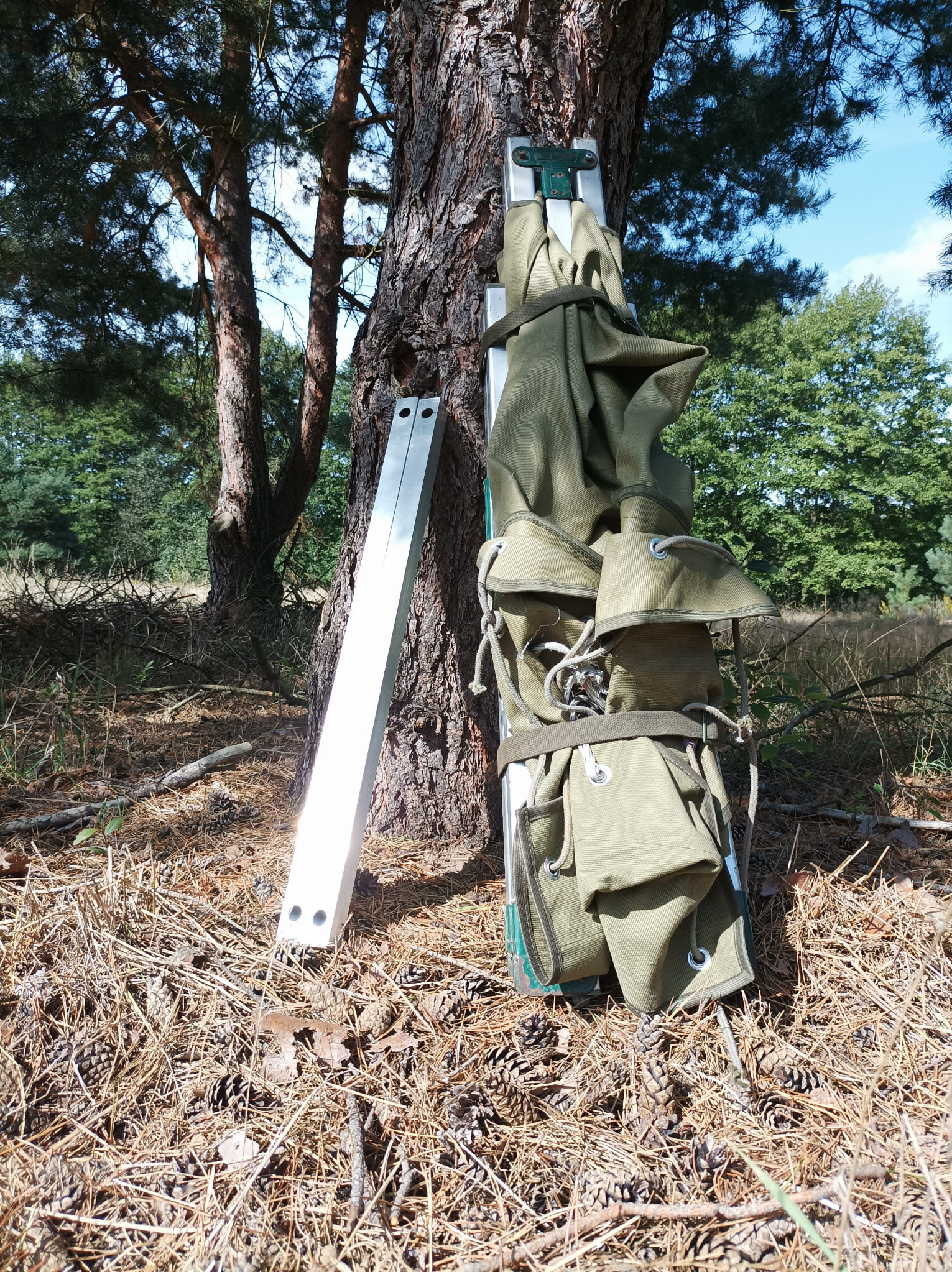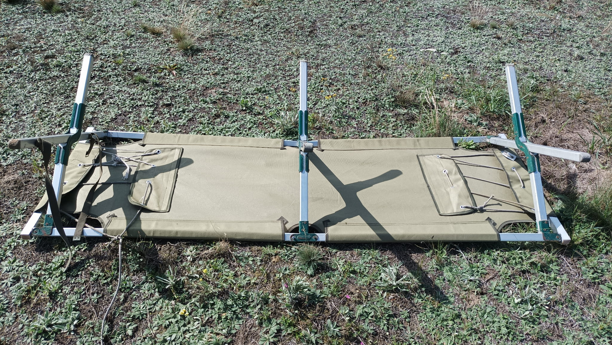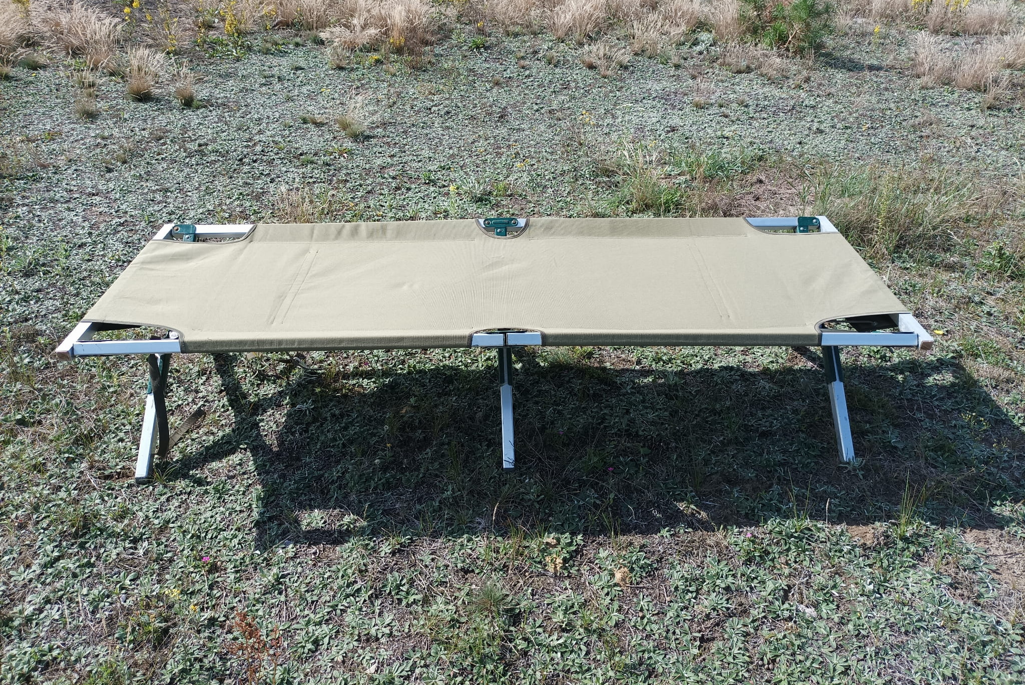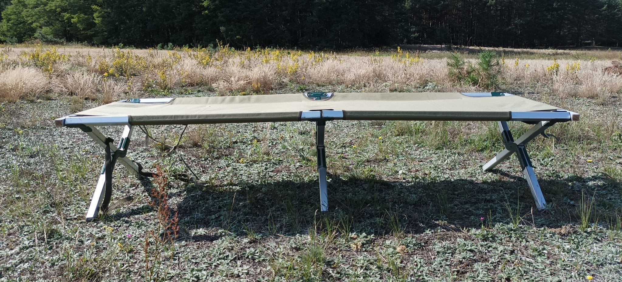 Konstrukcja łóżka oparta jest na trzech krzyżakach połączonych czterema podłużnymi elementami, na które nawleczone jest brezentowe poszycie stanowiące po rozłożeniu leżysko.