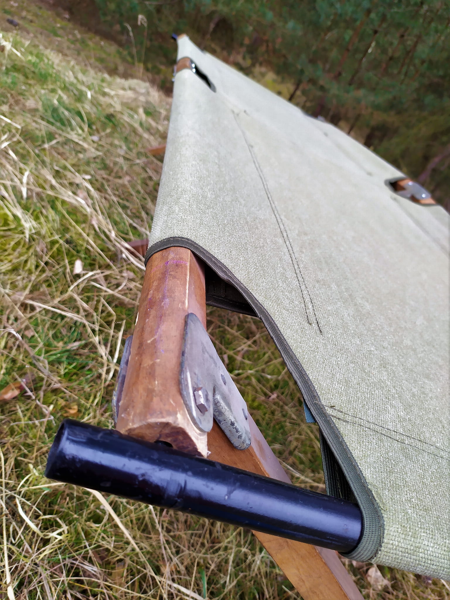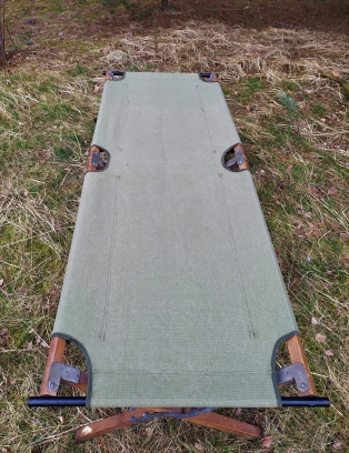 Konstrukcja łóżka oparta jest na trzech krzyżakach połączonych czterema podłużnymi elementami, na które nawleczone jest brezentowe poszycie stanowiące po rozłożeniu leżysko.