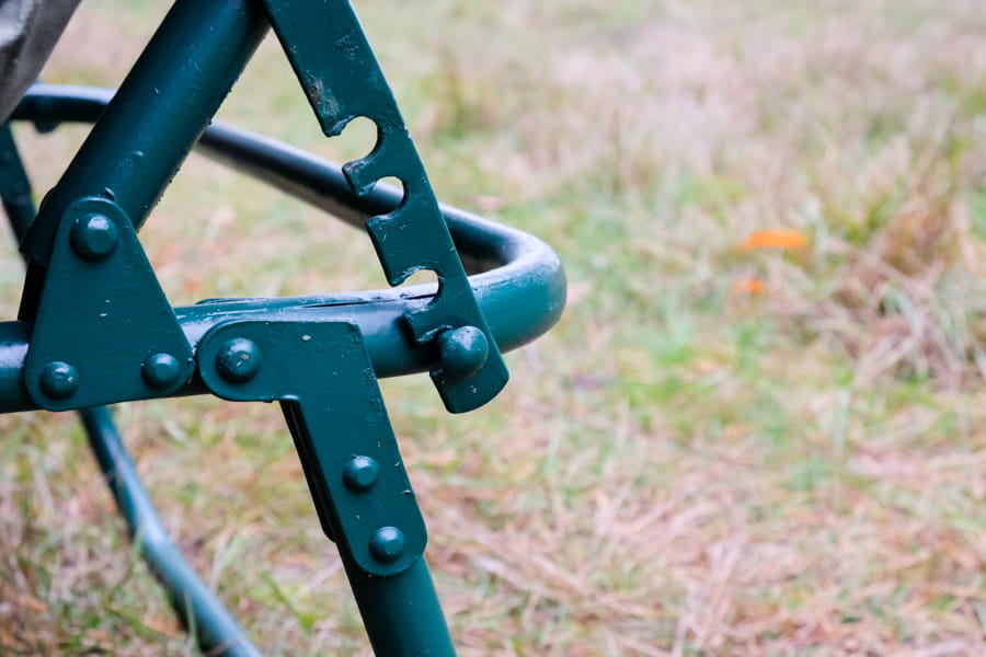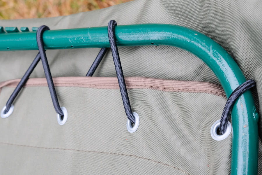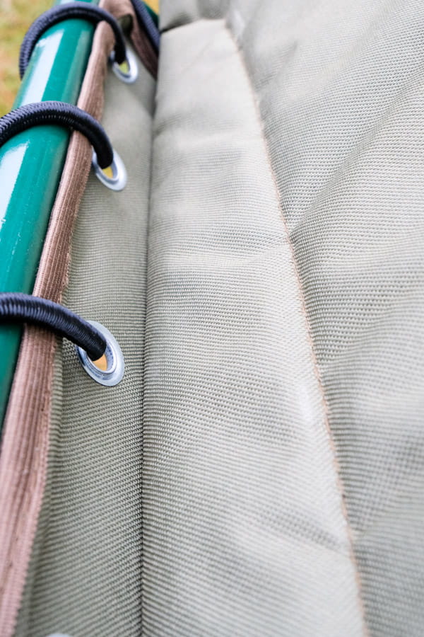 Leżysko wykonano z PODWÓJNEJ wodoodpornej tkaniny poliestrowej PCV. Między warstwami poliestru zastosowano wzmocnienie z tkaniny brezentowej o gramaturze 540, co zwiększyło odporność leżyska na przetarcia i rozdarcia, zwłaszcza w okolicy oczek. Leżysko przymocowane do stelaża gumą o średnicy fi 6, używanej przy mocowaniu plandek na tirach.