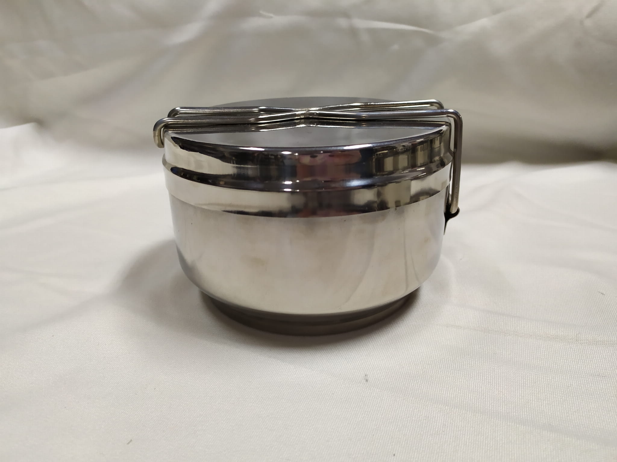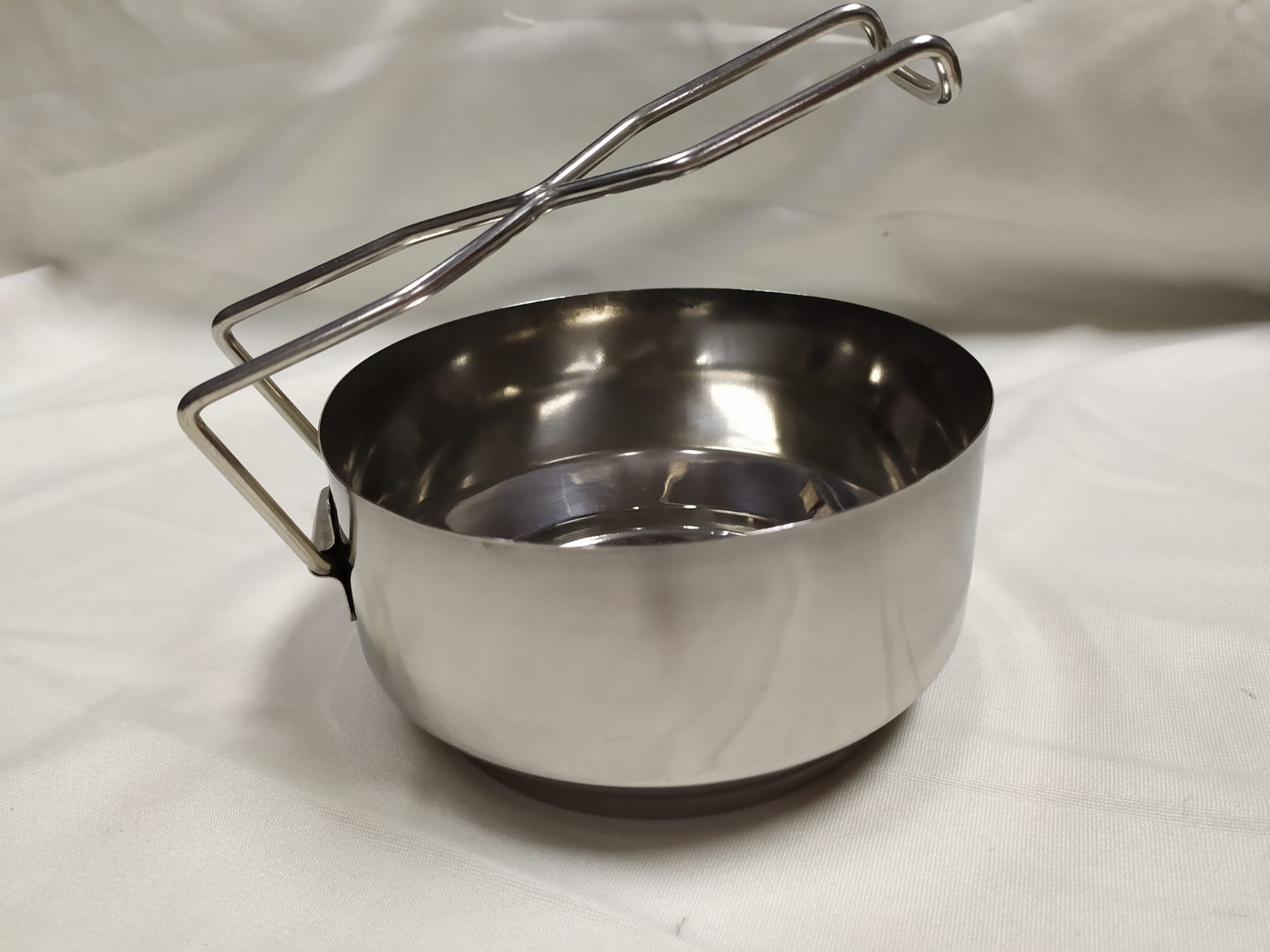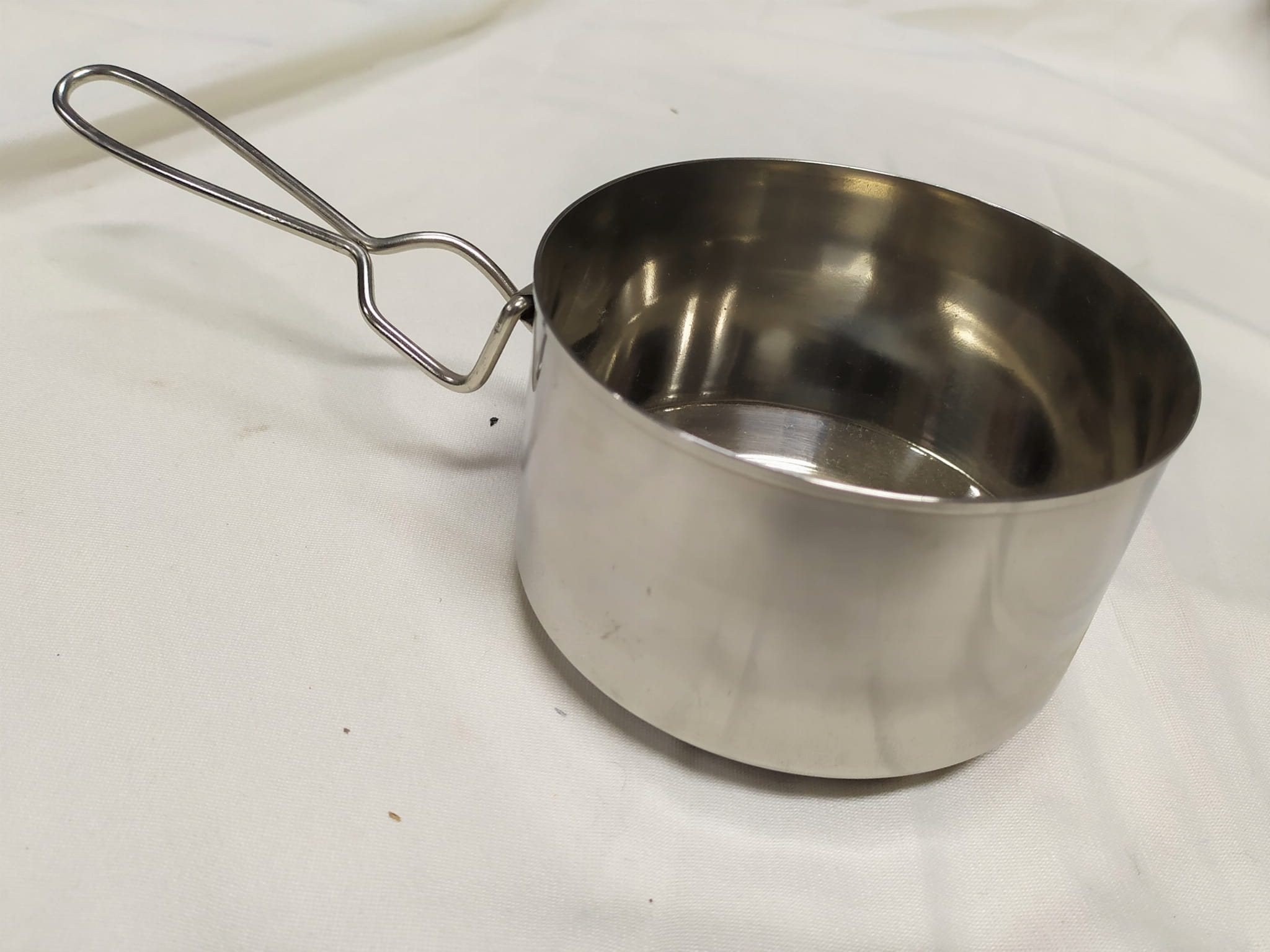 Menażka harcerska zrobiona ze stali nierdzewnej w stanie powystawowym (możliwe są rysy czy otarcia).