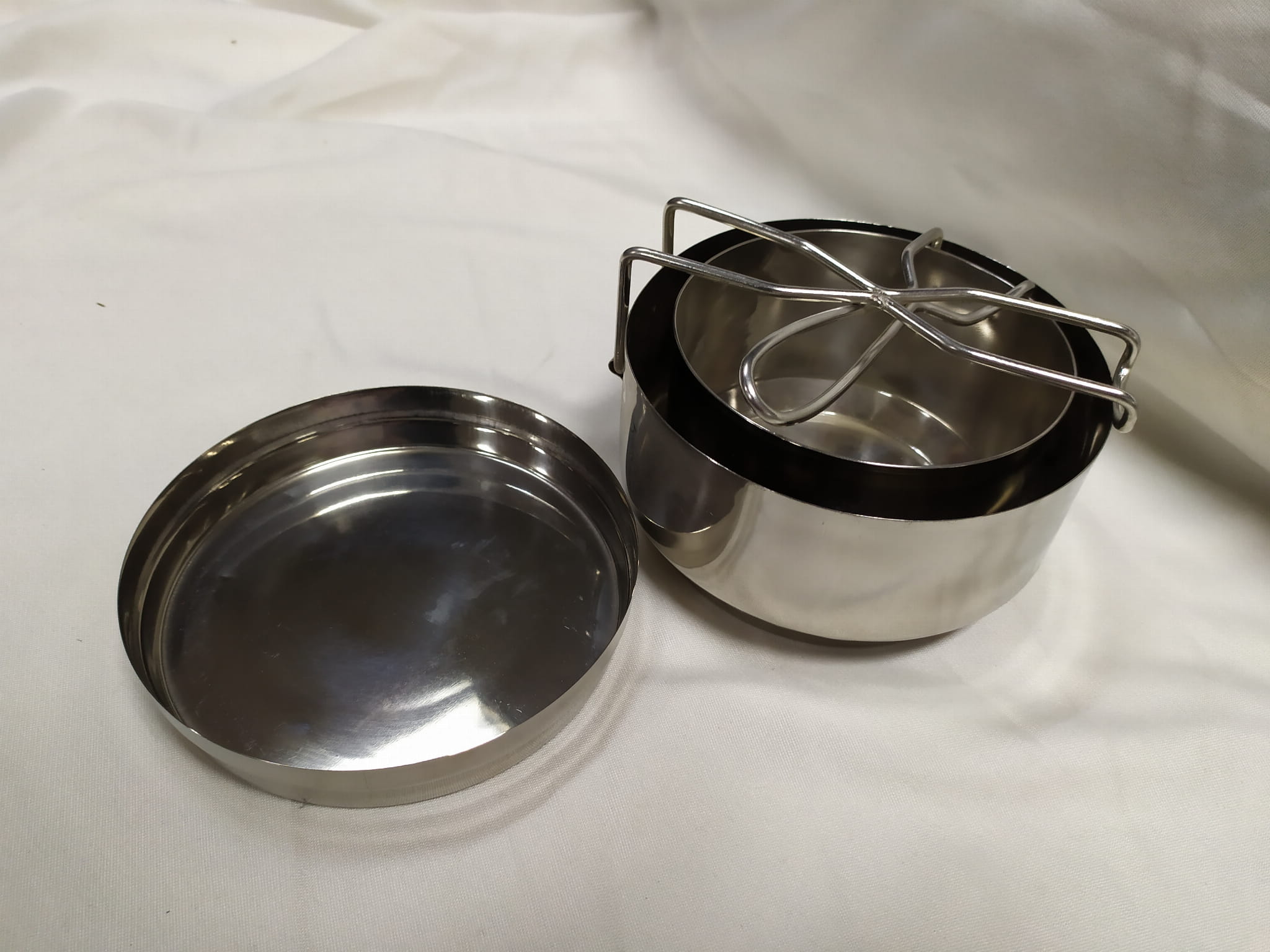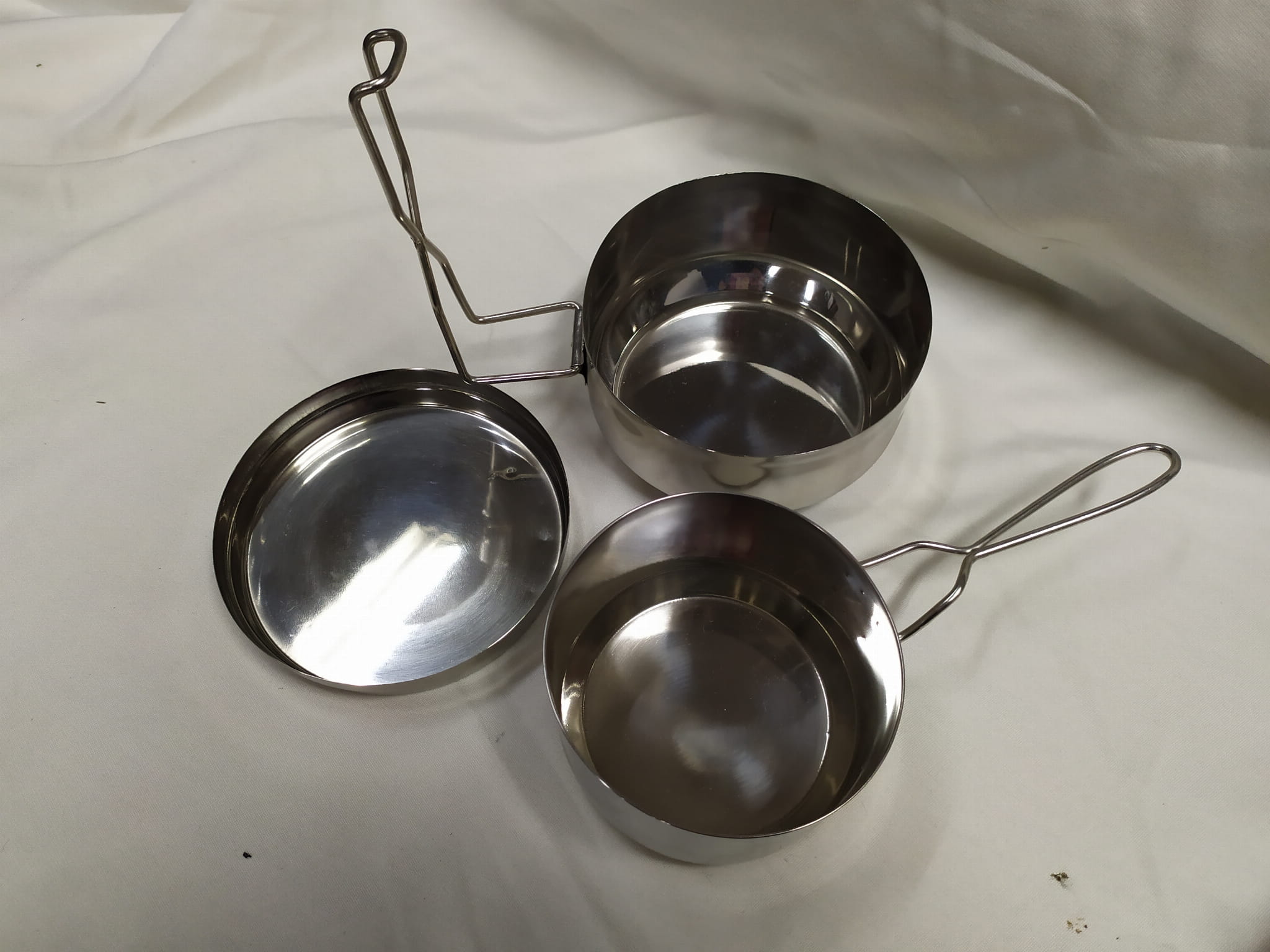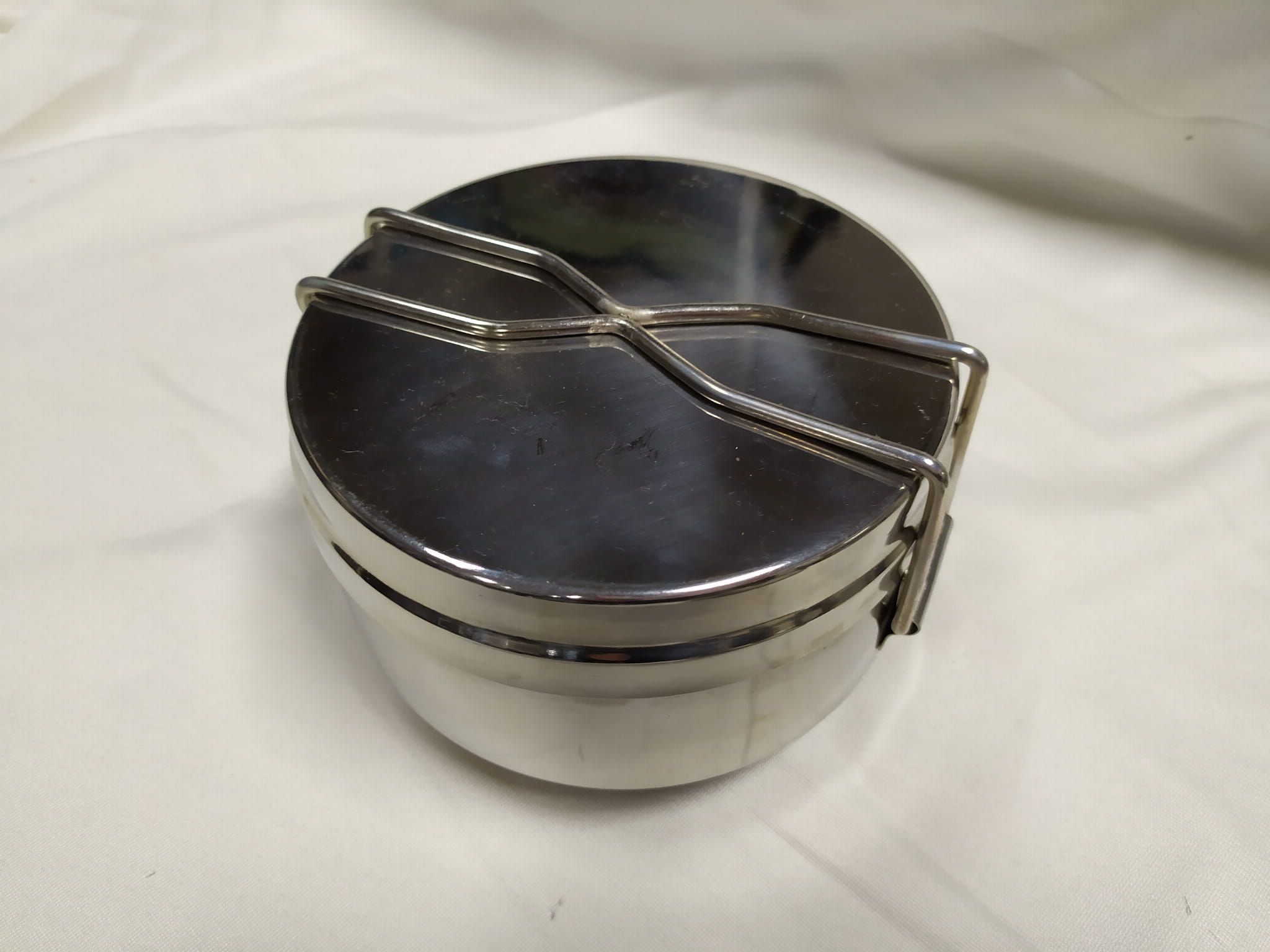 Menażka harcerska zrobiona ze stali nierdzewnej w stanie powystawowym (możliwe są rysy czy otarcia).